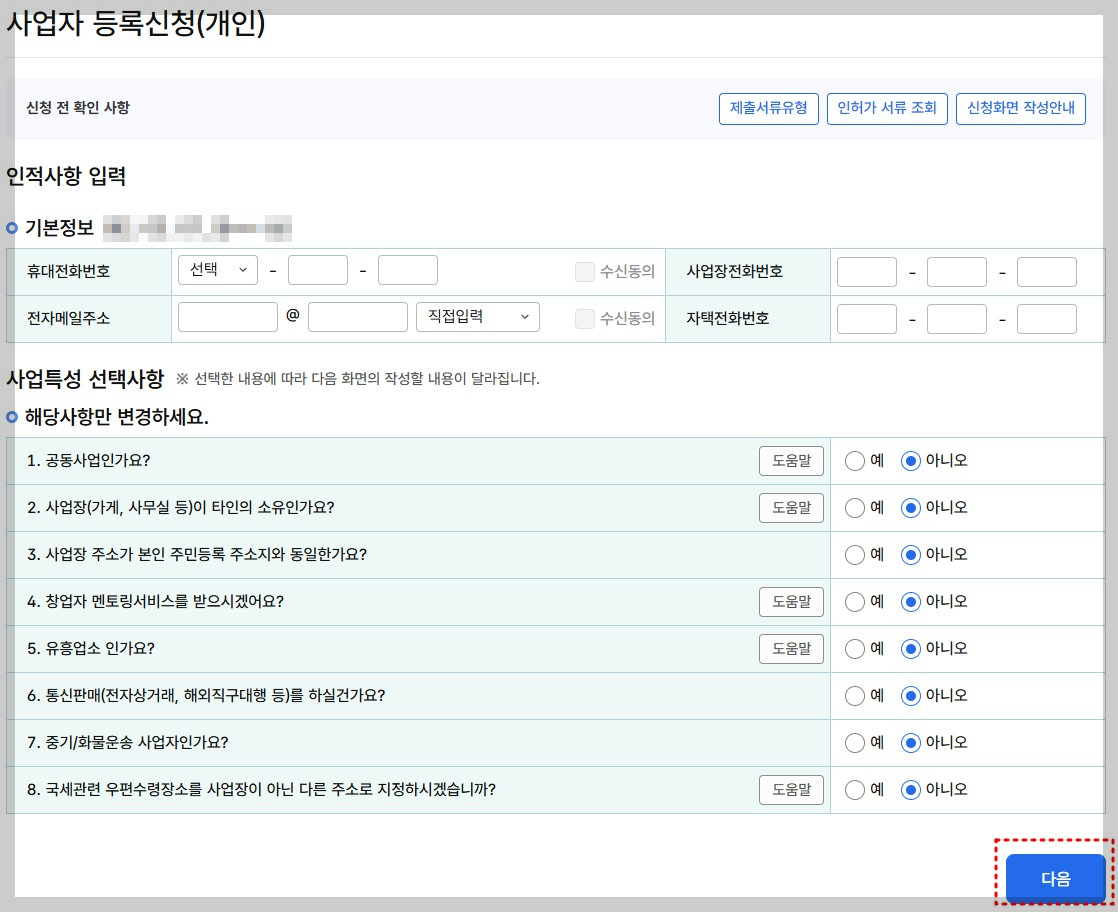 (연 매출 8천만 원 이하 예상 시 간이과세자 선택 가능) - 사업장 정보 입력: 주소, 업종 선택 (온라인 사업은 "전자상거래업" 추천)