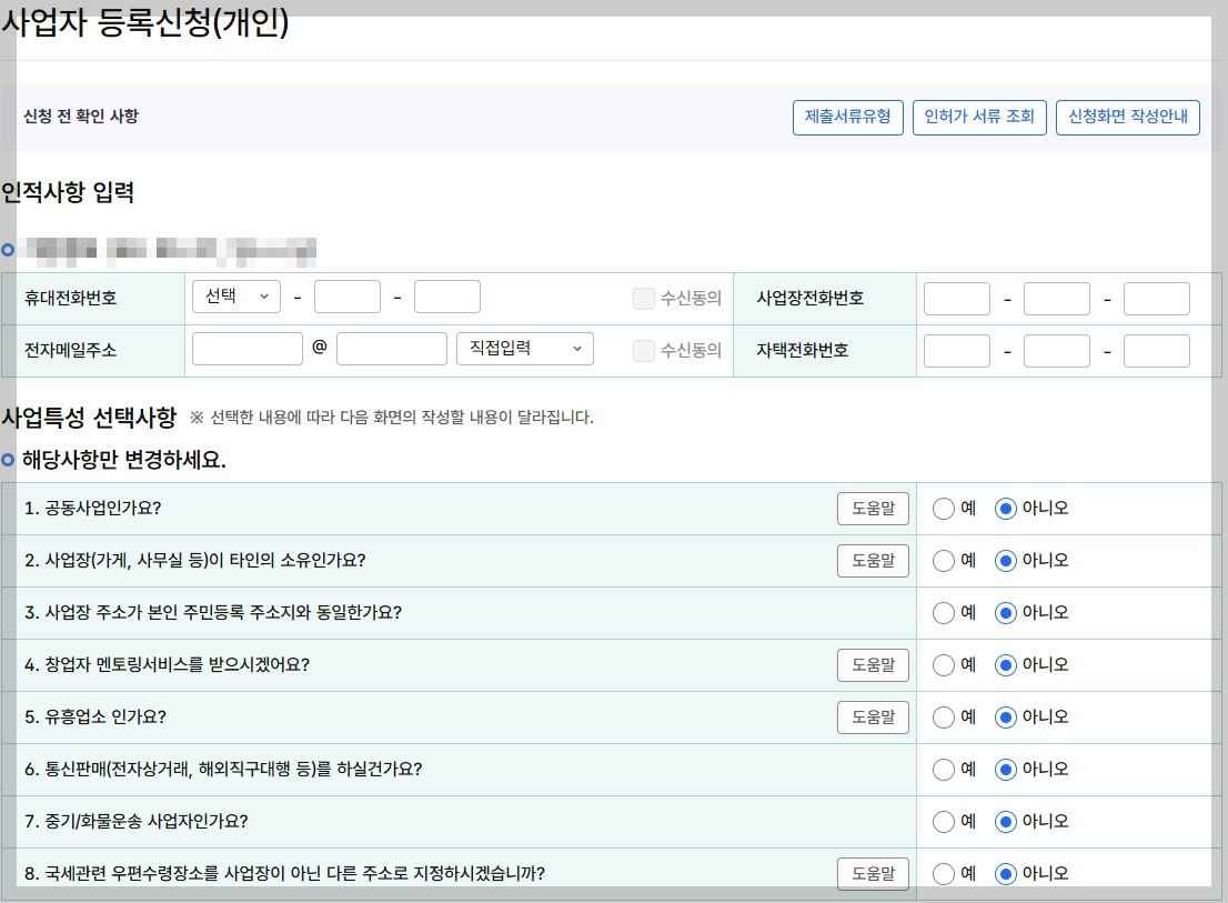 - 간이과세자/일반과세자 구분: 사업 규모에 따라 선택